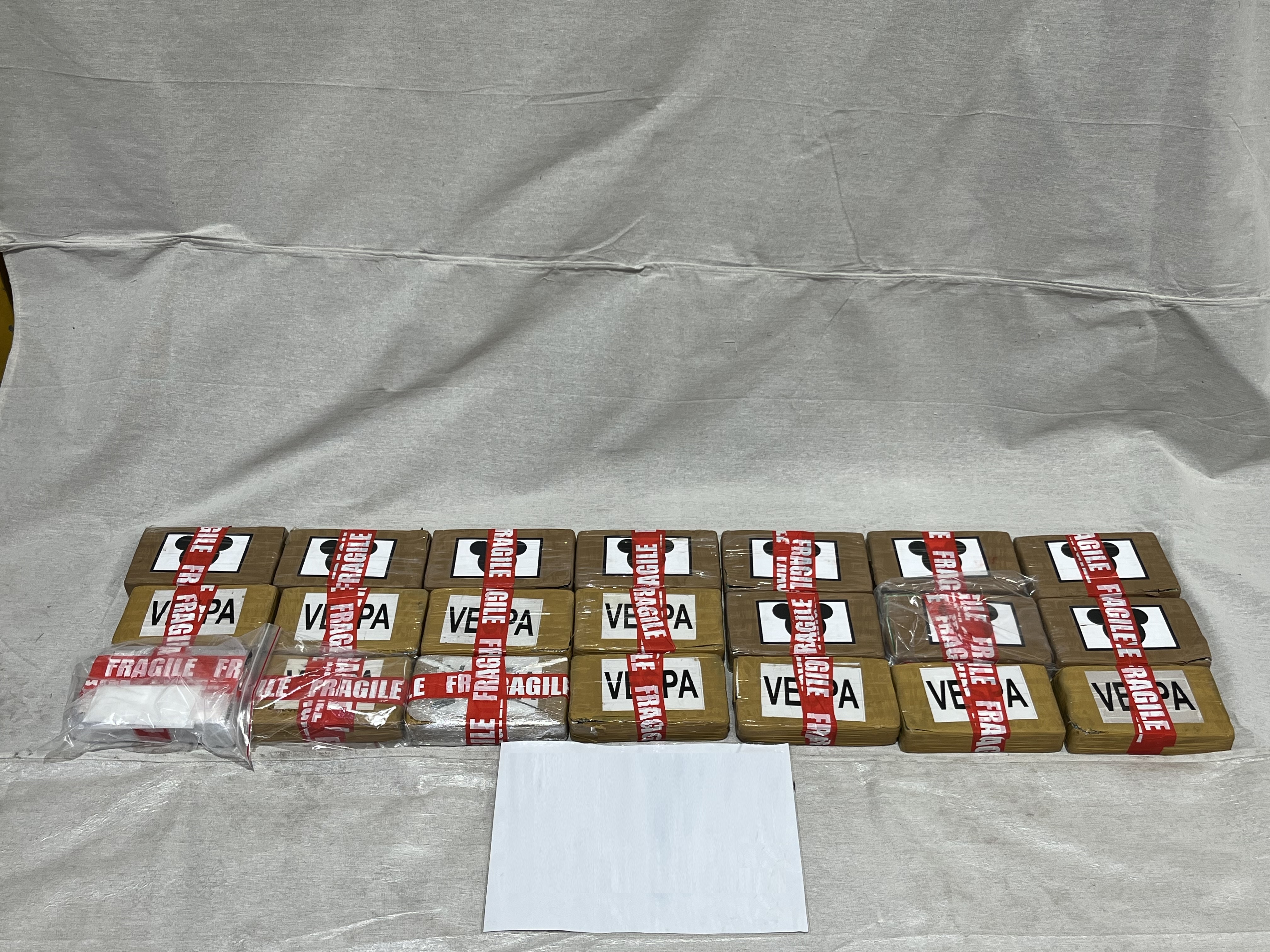 During x-ray screening, anomalies were identified in the imagery, which led to a physical inspection of the container. Inside the container, amongst legitimate goods, Customs officers located a shrink-wrapped duffel bag inside with 21 bricks of cocaine branded with ‘VESPA’ and a ‘mouse logo’ and wrapped in fragile tape.